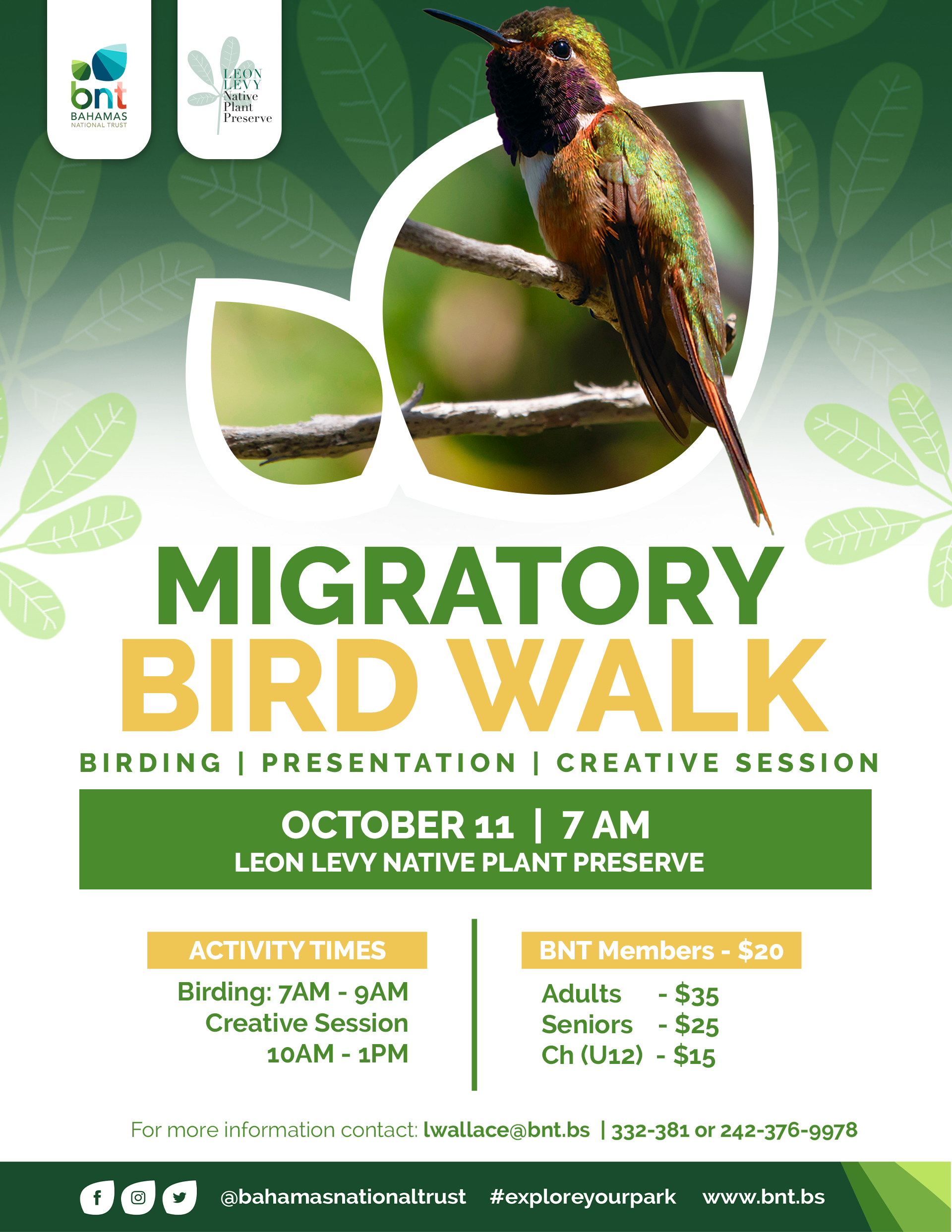 Join the Bahamas National Trust for a guided Migratory Bird Walk and discover the incredible feathered travellers passing through our islands. Led by expert birders, this immersive experience will open your eyes to the wonders of migration season, as you spot and learn about species that journey thousands of miles to reach our shores.